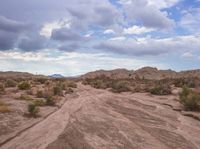 an empty dirt road leads to mountains on a cloudy day in the desert with large scrub bushes and grass growing along the edge
