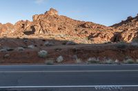 An empty road in the Nevada desert, surrounded by towering mountains and red rock formations. Clear skies highlight the barren landscape. A sign warns of no traffic in this Southwest badlands geology.