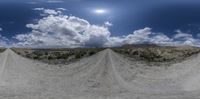 two empty dirt road with sun in sky in the background from different angles, two side by side