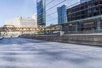 A modern architectural marvel in Chicago, Illinois. The cityscape reflects on the clear sky, creating a stunning urban scene. The downtown skyline dominates the metropolitan area, while the concrete streets and Armco barriers showcase the city's bustling road system.