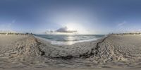 a wide fish eye view looking out towards a beach and the ocean at sunset,