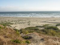 This is an image of a gloomy coastal landscape in California, USA. The photo shows an asphalt road leading to an open space surrounded by grass. In the distance, the grey sky meets the misty ocean and the sandy beach. The waves crashing onto the shore create a gloomy atmosphere. Above, contrails can be seen against the clear sky. This photo represents a foggy day at the coast, capturing the natural environment and the serene beauty of the California landscape.