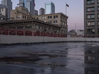 This photo captures the essence of city life in downtown Los Angeles, California. In the early morning hours, the reflection of the classic and modern architecture can be seen on the wet surface of the parking lot. The flagpole stands tall, hanging over the sidewalk. The clear sky overhead contrasts with the dark cityscape, highlighting the metropolitan area's bustling energy. This image represents the urban design and open spaces of Los Angeles, a city known for its high-rise buildings, office complexes, and condominiums. It is a depiction of the break of day and the beginning of a new day in the city.