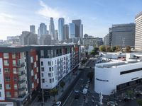This image captures the picturesque cityscape of downtown Los Angeles, California, USA. The modern architecture is highlighted by the high-rise buildings and skyscrapers that populate the urban metropolis. The clear sky above contrasts with the asphalt surface below, creating a stunning view of the city. The parking decks and garages are also visible, showcasing the urban design and metropolitan lifestyle of the area. This photo provides an impressive overview of the city, presenting a unique perspective on the bustling city life in Los Angeles.