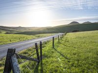 A scenic road in California, surrounded by lush green grass and rolling hills. The pasture and fields create a picturesque rural landscape. The highland offers an elevated view with clear blue skies and visible sun. A perfect sunny day in the natural environment of California.