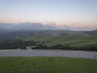 At the break of day in California, a car is parked on a lush green hill, offering a stunning view of the elevated mountain range. Nature's beauty is showcased in this serene landscape.