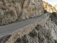 A stunning view of a mountain landscape in California, USA. The dawn light illuminates the rugged rock formations and elevated roads. The Armco barriers protect against the cliff outcrops and create a majestic scene.