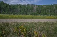 A picturesque scene of the USA's Colorado. A dirt road winds through green mountains and forests, surrounded by lush vegetation. The alpine landscape is dotted with aspen trees, while fields of colorful flowers contrast with the sandy streets of Crested Butte.