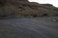 A stunning view of the desert landscape in Utah, USA at dawn. The red rock formations and mountainous terrain create a dramatic backdrop for the winding asphalt road. Clear skies and sparse vegetation enhance the beauty of this Highland hillside.