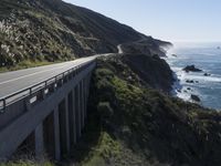 A scenic road in California's Big Sur region, winding along the rugged coastline. Concrete bridges and guard rails provide infrastructure along the highway. Majestic mountains, clear skies, and the vast Pacific Ocean create a picturesque landscape.