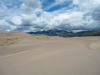 A breathtaking view of the Great Sand Dunes National Park in Colorado, USA. The open space and clear blue sky provide the perfect backdrop for the stunning desert landscape. Majestic mountains surround the sandy surface, creating a truly awe-inspiring natural scene.