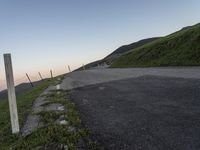 This is a beautiful image of a road surrounded by lush green grass and vegetation in California, USA. The road ascends a highland and offers a breathtaking view of the mountain pass and clear skies. The asphalt road surface winds through the landscape, creating a picturesque scene. It is dawn, and the soft morning light creates a serene atmosphere. The road is elevated and offers a panoramic view of the surrounding nature. This photo represents the natural beauty and stunning landscapes that can be found in California.
