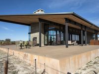 This stock photo showcases the stunning modern architecture of a residential building in California, USA. The building features a sleek facade with a concrete surface and a roof design that provides shade for the porch. The open space and beautiful landscape surrounding the property create a perfect blend of nature and contemporary design. The clear sky with contrails in the background adds to the serene atmosphere of this home. The photo also depicts the nearby agricultural areas, with vineyards and farms, creating a picturesque view. This image is perfect for real estate, travel, or architectural-themed projects.