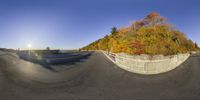 a fish eye view of a wide open road, with a wall surrounding it, and an autumn tree behind