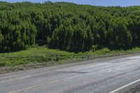 A scenic view of Slate River Road in Crested Butte, Colorado. The road winds through a forest of evergreen trees, with the majestic mountains in the background. Clear skies make for a perfect day to explore nature in the USA.