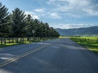 a empty road that goes through a grassy area with mountains in the background as well as trees