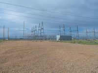Industrial power plant in the USA, surrounded by open space and natural vegetation. Clouds accentuate the landscape of a sunny day. Construction and manufacturing work can be seen on the dirt and gravel surface.