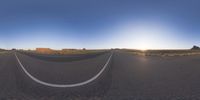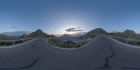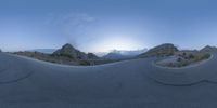 the panoramic image shows some sort of desert with rocks in the distance and on each end a long path is surrounded by grass