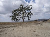 a lone tree on the side of a dry grass hill in front of two people with bicycles