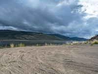 A scenic landscape in Colorado, USA. An open space with a beach and lake, surrounded by clouds and nature. The day is clear, with a dirt and gravel surface leading to the water.