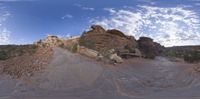 Utah's open landscape under a sunny sky, with hard shadows casting patterns on the rock and dirt surfaces. Gravel and sand areas contrast with the clear blue sky. Nature's beauty in a sunlit Utah day.