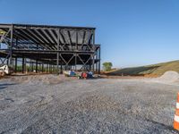 Sunny day on an open construction job site in the USA. Steel office building and architecture contrast with the dirt and gravel surface. Clear sky provides a backdrop for the construction equipment and off-road track.