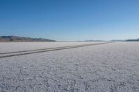 A breathtaking view of the California desert landscape with majestic mountains in the background. Off-road track cuts through the sandy plain, while a clear sky and salt lake on the horizon complete the picturesque scene.