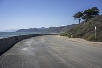 This is an image taken along the Pacific Coast Highway in California, USA. The picture shows a coastal landscape with a clear sky and the ocean in the background. The road is made of asphalt and is lined with trees and mountains. In the foreground, there is an Armco barrier separating the road from the beach. This photo captures the beauty of the California coastline and represents a typical day along the Pacific Coast Highway.