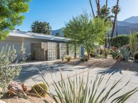 A modern architecture residential home in California. Elevated parking lot with clear skies and views of the Sonora Desert. Surrounded by bush and palm trees, this mid-century villa is a high-end suburban oasis.