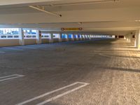 A suburban parking lot in Los Angeles, USA. The surface is covered in asphalt, casting hard shadows in the bright day. Residential buildings surround the parking deck, creating a typical suburban scene.