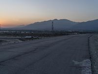 A stunning view of the Los Angeles landscape at dawn. The asphalt road meanders through the residential area, framed by mountains and hills. The suburban horizon glows in the evening light.