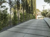A modern architecture walkway in Los Angeles, California. Lined with trees and vegetation, the walkway provides a scenic route through the city. The concrete and asphalt surfaces connect various properties and provide access to public spaces.