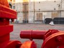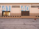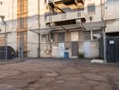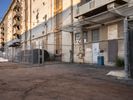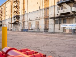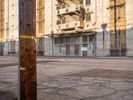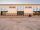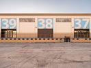 A straight asphalt road stretches into Los Angeles under a clear sky. It passes through industrial zones with warehouses and manufacturing depots. Open spaces and vegetation flank the roadside, characterizing the industrial landscape of California.