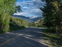 the road winds up on the mountainside on a sunny day with beautiful clouds and trees