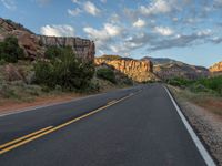 A road winding through the stunning landscape of Utah's canyons at dawn. Clouds form a dramatic backdrop against the asphalt, highlighting the natural beauty of this USA road trip destination.