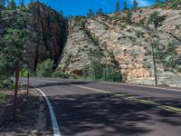 A road cutting through the breathtaking landscapes of Zion National Park in Utah, USA. Majestic mountains and vast open skies create a perfect backdrop for a scenic drive. Clouds add drama to the picturesque day.