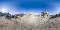 A panoramic view of a rugged desert landscape in California, USA. The open road stretches out into the distance, surrounded by low sand dunes and towering mountains. Clear skies and natural formations create an elevated and serene natural environment.
