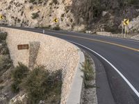 This is an image of a mountain road at dawn in California, USA. The asphalt road winds through the rugged landscape, surrounded by nature. The yellow lines on the road surface guide the way, while the rock walls and Armco barriers provide safety. This highway is a popular thoroughfare, leading to a mountain pass. The shoulder of the road offers a stunning view of the mountains. In the early morning light, the landscape takes on a golden hue. This photo captures the beauty and infrastructure of California's mountain roads.