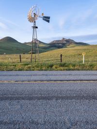 A picturesque California landscape at dawn. The road winds through the beautiful countryside, surrounded by lush green fields and rolling hills. In the distance, a windmill and radio telescope stand out against a clear sky.