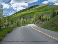 road in the mountains with grass and trees and a fence surrounding it on a bright day