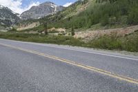A scenic view of a winding mountain road in Colorado, USA. The road surface is made of asphalt and tar, surrounded by breathtaking landscapes of mountains, forests, and highlands. Clouds fill the sky, adding to the natural beauty of this highway.