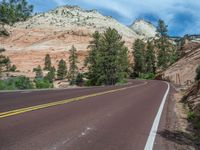 A road cutting through the picturesque landscape of Zion National Park in Utah, USA. Majestic mountains and cloudy skies create a stunning backdrop for this scenic route.