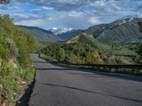 the road winds up on the mountainside on a sunny day with beautiful clouds and trees