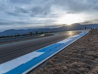 A race track at dawn in the USA. The asphalt road curves under the visible sun, as clouds scatter in the sky. The break of day creates a sunny and vibrant atmosphere for racing.