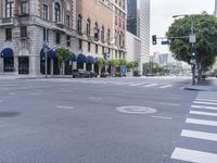 A classic architecture building stands on an empty street in Los Angeles, California. The modern architecture of surrounding office buildings complement the urban design. Vehicles line up at the zebra crossing near a restaurant in the bustling business district.