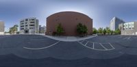 a 360 - spherical view of a street intersection with a building and cars in the background