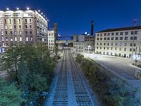 An elevated train track runs through a vibrant cityscape in Chicago, Illinois. The mix of residential and industrial buildings create an urban landscape. The night sky is illuminated by artificial light, giving the scene a vibrant and energetic feel.