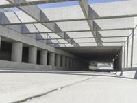 A skateboarder glides down a concrete walkway in Los Angeles, California. The Brutalist architecture of the surrounding buildings and concrete pillars create a unique urban landscape. The walkway leads to an underpass, adding to the city's architectural charm.