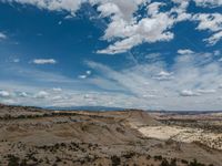 A top-down view of an asphalt road in the USA, cutting through the Utah landscape. Cloud-dotted open spaces offer an elevated perspective of nature. Daytime aerial overlook captures the high position of the road.