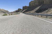 This is an image of a straight road stretching through the desert landscape of Utah, USA. The road is made of asphalt and is surrounded by red rock mountains and canyons of the San Rafael Swell. The clear sky contrasts with the low desert terrain and emphasizes the natural beauty of the area. The road surface is smooth and well-maintained, with an Armco barrier running along the slope. This photo represents the unspoiled nature and geology of Utah's canyonlands and is a perfect representation of the scenic highways of the region.